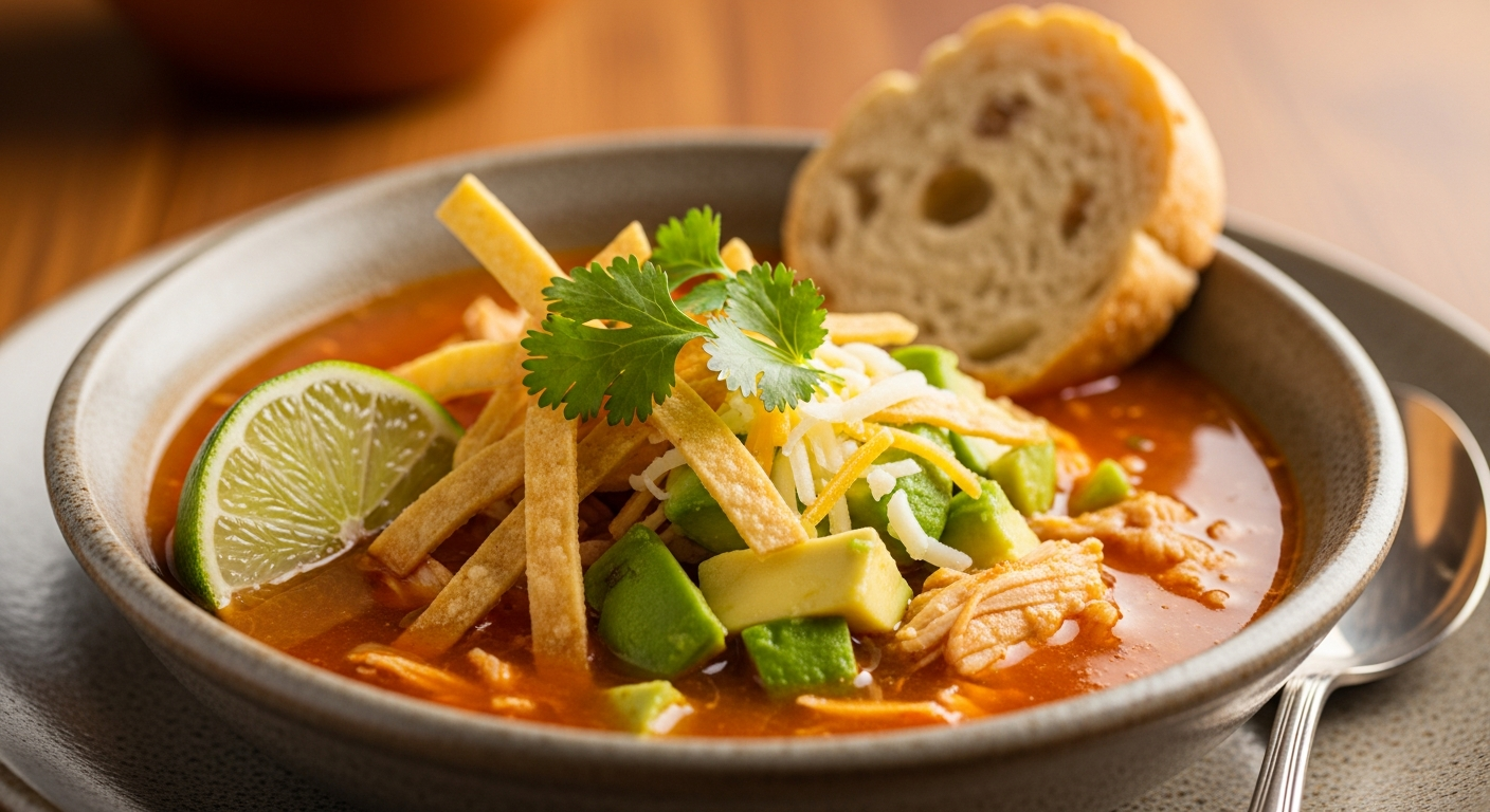 A: The recipe includes tender shredded chicken, a rich tomato and chili-infused broth, and a mix of vibrant vegetables like corn and black beans. Combined with the crispy tortilla strips and a hint of smoky spices, each spoonful offers depth and warmth that feels truly comforting.