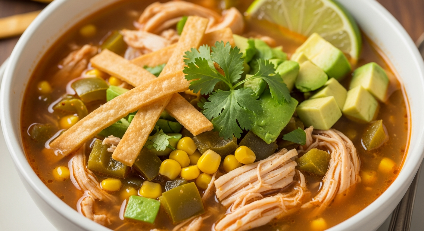 A: The recipe includes tender shredded chicken, a rich tomato and chili-infused broth, and a mix of vibrant vegetables like corn and black beans. Combined with the crispy tortilla strips and a hint of smoky spices, each spoonful offers depth and warmth that feels truly comforting.