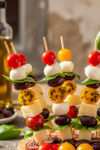 Colorful Antipasto Skewers: Olives, Cheese & Tomatoes Delight